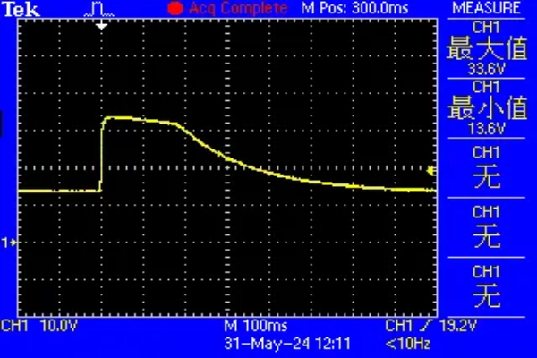 SM8S系列產(chǎn)品滿足ISO 7637-2的測(cè)試標(biāo)準(zhǔn),可以及時(shí)吸收尖峰電壓并將電壓穩(wěn)定在安全范圍內(nèi)。圖為SM8S24CA根據(jù)ISO7637-2標(biāo)準(zhǔn)中5A脈沖所測(cè)得的Vc波形圖。